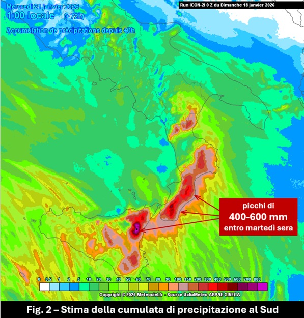 Se da un lato questa espansione favorirà l’arrivo da est di correnti più fredde – destinate a interessare soprattutto il Nord e il versante adriatico – dall’altro lo schiacciamento che subirà la depressione ad opera di questo blocco anticiclonico incrementerà sensibilmente il gradiente barico sull’area ionica e su quella tirrenica meridionale e quindi la pendenza dello scivolo virtuale su cui si muoverà la massa d’aria che giungerà sulle nostre regioni meridionali e in Sardegna sotto forma di venti basculanti tra scirocco e levante. L’intensa ventilazione dai quadranti sud-orientali, che soffierà con velocità medie tra burrasca e burrasca forte (65-85 km/h) e raffiche tra tempesta e fortunale (85-120 km/h) anche se non sono esclusi picchi superiori specie allo sbocco delle valli per il noto «effetto Venturi», trasporterà una quantità di vapore acqueo ben superiore a quella consona al periodo tanto che, anche nelle ultime elaborazioni della modellistica numerica, si ritiene che il flusso umido in arrivo possa avere caratteristiche di eccezionalità per questo periodo dell’anno. Lo sbarramento che le correnti troveranno andando a impattare sui versanti orientali dei rilievi della Sardegna, della Sicilia e della Calabria incentiverà la rapida condensazione del contenuto di vapore e la formazione di forti precipitazioni che, entro martedì sera, cadranno anche a carattere di violento nubifragio raggiungendo probabilmente cumulate di 100-150 millimetri su vaste aree costiere e ad esse prossime, in rapido incremento procedendo verso i settori montuosi dove sui versanti esposti non è escluso il raggiungimento di picchi compresi tra i 400 e i 600 millimetri (figg. 2 e 3).