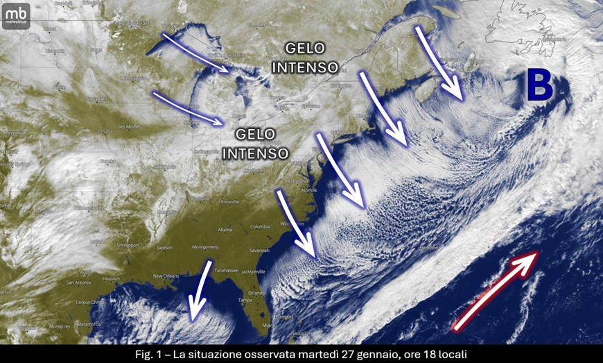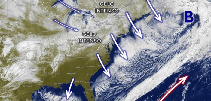 Il nuovo equilibrio atmosferico che si viene a generare si manifesta così con la formazione di nubi a ciottolato che seguono il movimento delle correnti portanti e si muovono verso il nostro continente. In questi giorni questa dinamica sta caratterizzando la fascia oceanica prossima alle coste orientali degli Stati Uniti dove, come abbiamo spiegato in uno degli ultimi interventi, è transitata un’intensa depressione che ha richiamato aria artica dal Canada e ha fatto precipitare molti stati americani in un’intensa ondata di gelo. Dal Golfo del Messico al Golfo di San Lorenzo, le correnti gelide in uscita dal continente stanno interagendo con le acque superficiali dell’Oceano Atlantico per generare proprio quelle nubi cumuliformi che si organizzano in filari e che, ruotando in senso antiorario, definiscono la circolazione ciclonica che in queste ore ha portato il proprio centro motore a sud di Terranova e che presto entrerà nel letto delle correnti occidentali per raggiungere probabilmente le Isole Britanniche nella giornata di venerdì 30. La stessa interazione tra l’aria gelida e le acque relativamente più tiepide di può osservare anche nella zona dei Grandi Laghi: in questo caso, le sponde che si trovano esposte allo scorrimento dell’aria gelida sulle superfici lacustri ricevono abbondanti nevicate proprio per questo fenomeno conosciuto come «Lake Effect Snow».
