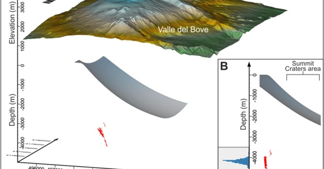 La figura mostra, in 3D, le zone in cui si trovavano le sorgenti di massa e pressione sotto la sommità del Monte Etna tra ottobre e dicembre 2018. I punti rossi rappresentano le soluzioni delle inversioni Monte Carlo dei dati di deformazione, mentre la superficie grigia indica l’area in cui le sorgenti di massa dovevano trovarsi per spiegare le variazioni di gravità osservate. La sezione est-ovest evidenzia anche la distribuzione di probabilità relativa alla profondità della sorgente di pressione.