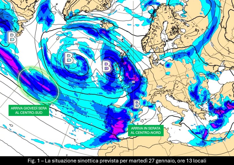 Si è spalancata la porta atlantica e i ronti perturbati entrano ormai senza soluzione di continuità alle nostre latitudini, sotto la guida di un nastro depressionario che si snoda dalle coste canadesi fino all’Europa occidentale: si tratta di una situazione che, con buona probabilità, ci accompagnerà almeno per tutta questa settimana ma che potrebbe ancora perdurare anche nei primi giorni della prossima dal momento che, secondo le ultime elaborazioni, non si scorgono segnali sostanziali di cambiamento nella distribuzione dei centri motore che governeranno il tempo sull’Europa centro-occidentale fino ai primi giorni di febbraio. Gli impulsi si susseguiranno così a intervalli quasi regolari che concedono tra le dodici e le trentasei ore di pausa tra una perturbazione che si allontana e un’altra che è pronta a subentrare con nuove nubi e nuove precipitazioni.