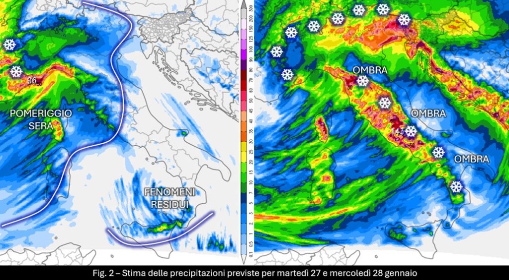 Le precipitazioni più significative interesseranno soprattutto la Liguria a partire dal Ponente e si estenderanno a Levante in serata. Nevicate sulle Alpi centro-occidentali fino a quote di 700-800 metri e inferiori – intorno ai 300-500 metri – sul basso Piemonte e sui versanti padani dell’Appennino Ligure di ponente. Nella giornata di mercoledì la perturbazione proseguirà a interessare la nostra penisola estendendo i propri fenomeni alla maggior parte delle nostre regioni (fig. 2, a destra). Le precipitazioni più organizzate interesseranno soprattutto il Nord-Est ed il versante occidentale, dal Levante Ligure alla Campania e alla Sardegna: in particolare, le cumulate più abbondanti dovrebbero concentrarsi tra il Lazio e il versante occidentale dei rilievi abruzzesi, dove si potrebbero localmente superare i 100-120 millimetri di pioggia nell’arco della giornata. A causa della provenienza sud-occidentale delle correnti che guideranno la perturbazione, i fenomeni si presenteranno in forma più irregolare sul versante adriatico e in parte anche sull’Emilia orientale e la Romagna che si troveranno in parziale ombra pluviometrica.