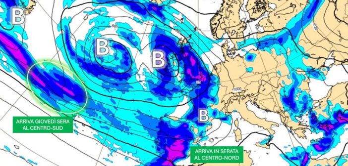 Proprio come accadrà tra martedì e venerdì (fig. 1), quando la nostra penisola sarà raggiunta dapprima dal fronte perturbato presente tra la Francia e la penisola iberica e successivamente dal sistema visibile ancora in aperto Oceano. La prima perturbazione giungerà sulle nostre regioni centro-settentrionali tra il tardo pomeriggio e la serata di martedì e completerà il passaggio sull’Italia tra mercoledì e giovedì. Il secondo impulso, invece, ci raggiungerà nella seconda parte di giovedì e, mantenendo una traiettoria più meridionale, dovrebbe interessare soprattutto le nostre due Isole Maggiori e le regioni del Centro-Sud. Se ci concentriamo sul passaggio della prima perturbazione, si evidenzia il peggioramento piuttosto rapido che si concretizzerà nella seconda parte di martedì a partire dal Nord-Ovest e dalla Sardegna e che si estenderà poi, entro sera, al resto delle regioni settentrionali e al versante tirrenico centro-settentrionale (fig. 2, a sinistra).