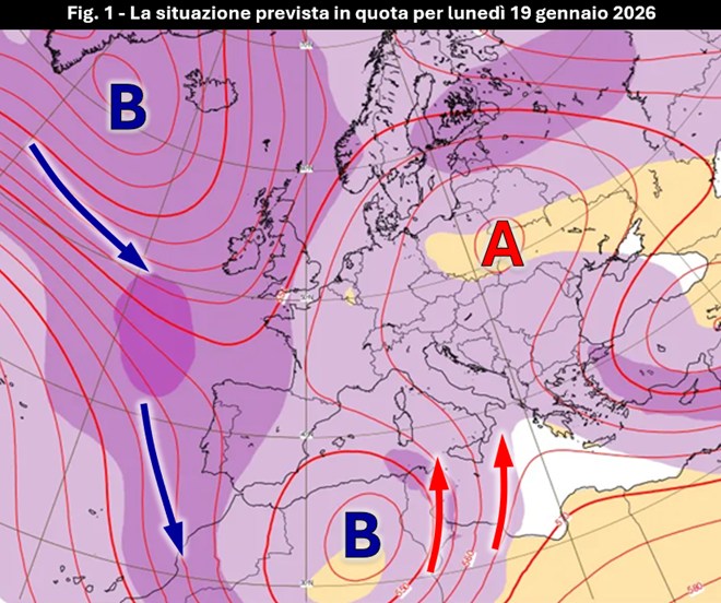 A poco più di una settimana da quell’episodio, caratterizzato da accumuli pluviometrici particolarmente abbondanti, torniamo a parlare nuovamente dell’argomento perché la dinamica atmosferica tenterà, nei prossimi giorni, di riproporre uno scenario abbastanza simile dal punto di vista della fenomenologia che ne potrebbe scaturire.Abbiamo infatti già accennato, nella recente analisi pubblicata, a un cambio della circolazione alle nostre latitudini indotto dall’ingresso sempre più incisivo del flusso perturbato atlantico che nel fine settimana accompagnerà l’ingresso di una profonda saccatura sul Mediterraneo occidentale, fino a farla sprofondare sull’entroterra nord-africano (fig. 1). La lenta evoluzione del minimo rappresenterà sicuramente una complicazione per la traslazione del sistema che si troverebbe bloccato da una forte figura di alta pressione sulla penisola balcanica e che quindi sarebbe costretto a concentrare la propria fenomenologia soprattutto lungo i versanti che si troveranno sopravvento alle correnti dominanti, provenienti in prevalenza nei bassi strati tra scirocco e levante.