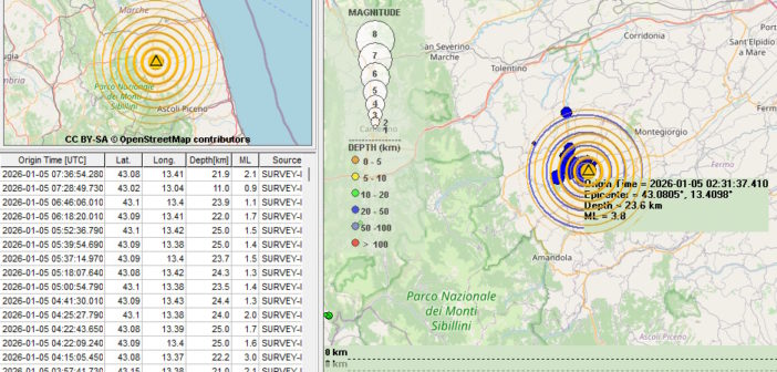 Una serie di scosse di terremoto è stata registrata nelle ultime ore nella zona di S.Angelo in Pontano (MC) nelle Marche. Gli eventi hanno raggiunto l’intensità massima (alle ore 08.50) di Ml 3.8 alle ore 03:31:37 e di Ml 3.1 alle ore 03:38:38 e Ml 3.0 alle ore 05:15 con ipocentro alla profondità compresa tra 22 e 29 km. Le scosse pari o superiori a Ml 2.0 sono avvenute con questa successione:
