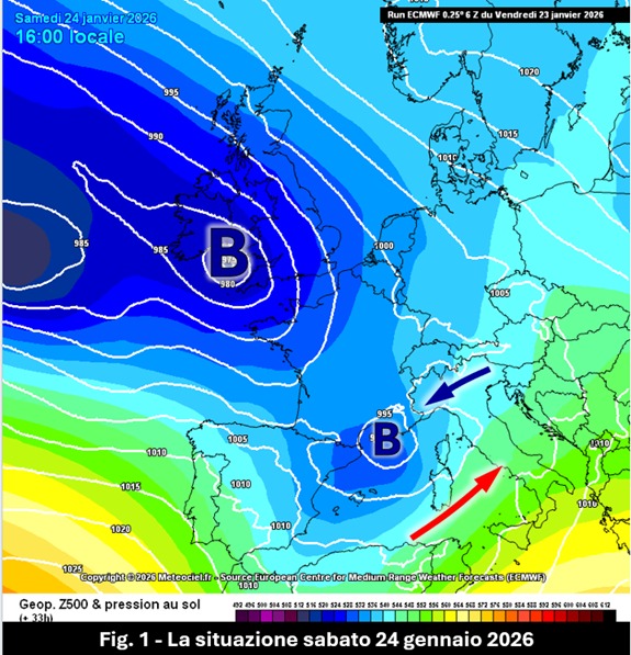 Con il passaggio del ciclone Harry siamo entrati in una fase meteorologica particolarmente dinamica in cui a condizionare lo stato del tempo sul Mediterraneo saranno le correnti perturbate atlantiche. Si è infatti materializzato quel canale depressionario, esteso dall’isola di Terranova alle Baleari, lungo il quale si muoveranno diversi sistemi perturbati destinati ad interessare anche la nostra penisola. L’ultimo anello della catena di cicloni è quello che attualmente è posizionato a ovest del Canale della Manica e che, con una fitta rete di isobare concentriche attorno a un minimo di ben 958 hPa, sta estendendo la propria influenza anche al settore occidentale del nostro bacino dove entro domani, sabato 24 gennaio, si formerà un minimo secondario di 990 hPa nei pressi del Golfo del Leone (fig. 1).