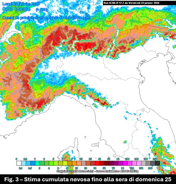La direzione di provenienza delle correnti, in prevalenza dai quadranti sud-occidentali, andrà come sempre a concentrare la fenomenologia più organizzata tra la Liguria e il versante tirrenico dove, specie a ridosso dei rilievi, si potrebbero registrare cumulate superiori ai 50-60 millimetri in questo periodo considerato. Le precipitazioni saranno invece meno probabili sull’area ionica – recentemente interessata dalla grave ondata di maltempo – e sul medio versante adriatico. Dal momento che il passaggio dei due sistemi avverrà in un contesto di correnti non particolarmente fredde, le nevicate al Centro-Sud saranno relegate ai rilievi montuosi: le quote, più elevate sabato e in calo domenica, oscilleranno dapprima dai 1000-1200 metri dell’Appennino settentrionale ai 1600-1800 metri di quello meridionale e successivamente, con l’ingresso dell’aria polare marittima sospinta dalla circolazione ciclonica, sulla dorsale appenninica si scenderà domenica dai 700-800 metri dei rilievi settentrionali ai 1200-1400 metri di quelli meridionali. Sarà un po’ diverso, invece, lo stato termico della colonna d’aria sul Nord Italia ed in particolare sul settore occidentale tra l’astigiano, l’alessandrino, il cuneese, il piacentino, il pavese e l’entroterra ligure di ponente tra il genovesato e il savonese: qui, la presenza di sacche d’aria più fredda – la cui temperatura oscillerà tra -2 e +2 °C a circa 400 metri e tra 0 e -2 °C a circa 1300 metri – garantiranno probabilmente una condizione di omotermia che sarà indotta anche dalle precipitazioni, nevose fino a quote di bassa collina e occasionalmente anche fino in pianura, seppur con accumuli scarsi o nulli (fig. 3).