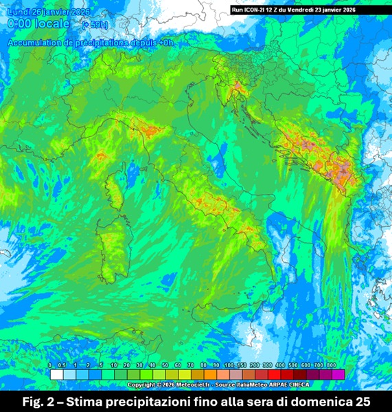 Questa evoluzione sarà accompagnata dal passaggio di due impulsi: il primo attualmente in transito a partire dal Nord-Ovest e in esaurimento entro domani ed il secondo, in rapida successione, in arrivo nella serata di domani e in allontanamento entro domenica. L’effetto combinato delle due perturbazioni sarà quello di distribuire abbastanza equamente le precipitazioni che sono previste interessare quasi tutte le nostre regioni entro le prossime 48-60 ore (fig. 2).