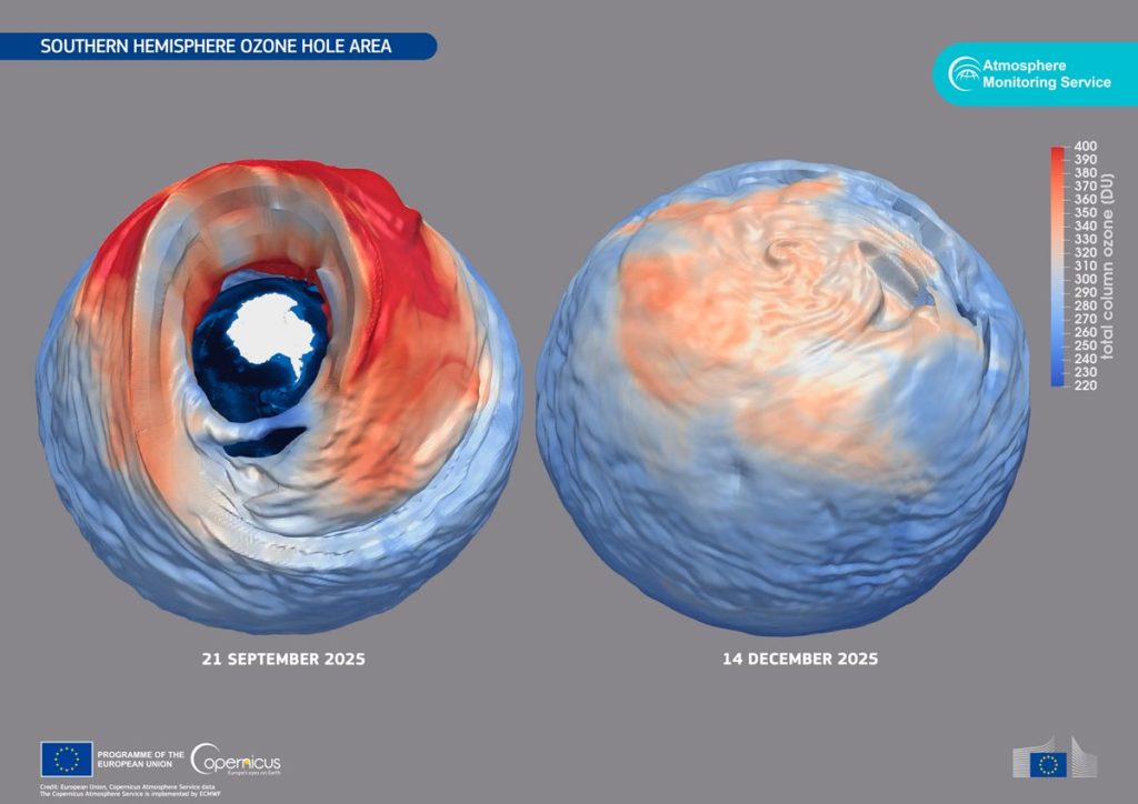 A novembre, ha iniziato a restringersi rapidamente, facendo ipotizzare una sua chiusura anticipata. Anche se una piccola macchia di basso ozono è rimasta persistente, il buco si è finalmente chiuso all’inizio di dicembre, una delle chiusure più precoci degli ultimi 40 anni.