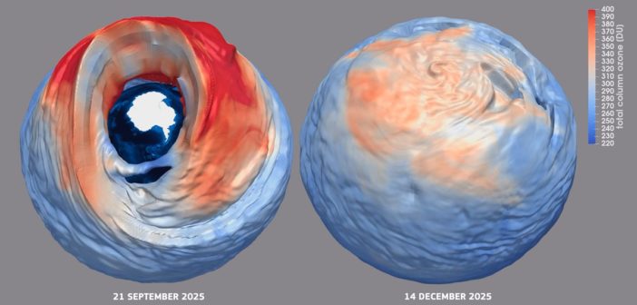 Questa visualizzazione, creata utilizzando i dati del Copernicus Atmosphere Monitoring Service (CAMS), è un rendering 3D del buco dell’ozono. Mostra la massima estensione del buco dell’ozono sull’Antartide nell’emisfero meridionale il 21 settembre, così come la situazione il 12 dicembre, dopo la chiusura del buco dell’ozono.