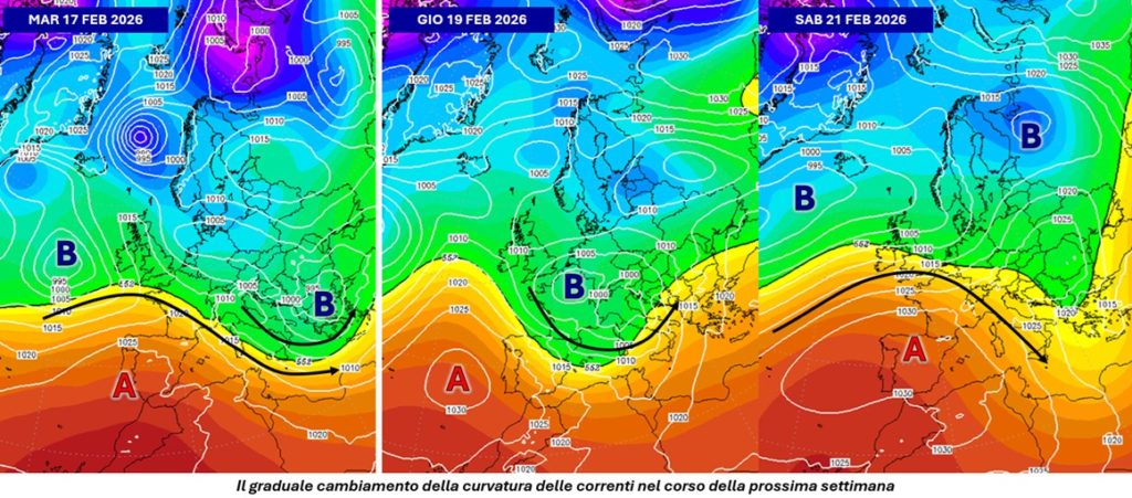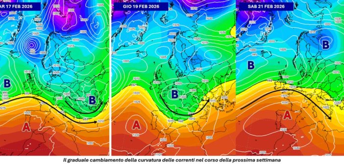 Nel corso degli ultimi 6-7 giorni sul Mediterraneo centro-occidentale è stato raggiunto l’apice dell’intensità della lunga fase perturbata che ci interessa ormai da oltre un mese: con il passaggio di tre distinte depressioni, due delle quali hanno raggiunto nel proprio centro valori minimi di pressione intorno ai 980 hPa, abbiamo in pratica osservato la massima espressione delle condizioni di maltempo meteomarino. Come abbiamo già anticipato nell’ultima analisi, lo scenario che va ora profilandosi nel corso della terza settimana di febbraio vedrà un cambiamento della configurazione sinottica perché si concretizzerà, giorno dopo giorno, una graduale rotazione delle correnti portanti del tempo che, dall’essere prevalentemente cicloniche diventeranno anticicloniche. Il primo segnale di questa tendenza è già ben evidente sulla penisola iberica, dove si è instaurata l’ala orientale dell’Anticiclone delle Azzorre che ha così chiuso la strada meridionale al transito dei sistemi perturbati. Nei prossimi giorni altri impulsi riusciranno comunque a interessare ancora le nostre regioni, ma in un contesto che vedrà le correnti in quota entrare da nord-ovest in seno a minimi meno profondi ma ancora capaci di organizzare la fenomenologia attorno a superfici frontali ben definite.