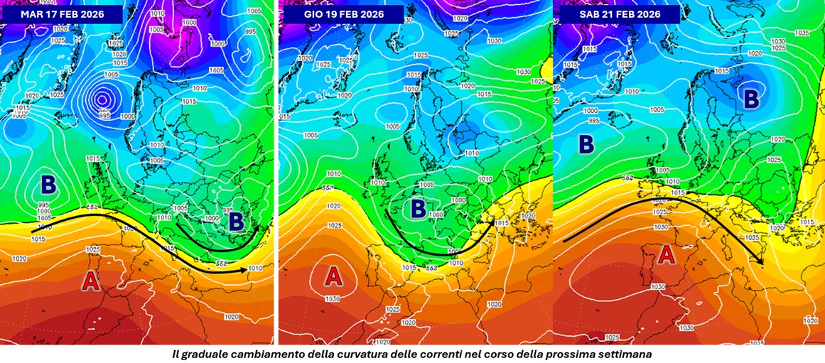 Dopo il passaggio di una nuova perturbazione – che entro martedì interesserà soprattutto il versante adriatico centro-meridionale e il basso versante tirrenico pur continuando ad apportare abbondanti nevicate da sbarramento sui versanti esteri delle Alpi occidentali e in forma minore su quelle centrali – si profilerà il passaggio della saccatura che tra giovedì 19 e venerdì 20 chiuderà questo periodo piovoso: al transito di questa perturbazione sarà inoltre associato il temporaneo rientro dai quadranti orientali di una massa d’aria più fredda che sarà sollecitata a raggiungere l’Italia anche da una rimonta anticiclonica che andrà profilandosi da ovest e che incalzerà la saccatura in allontanamento verso levante. Con questo ultimo passo, si andrà verso una fase più stabile e mite che potrebbe durare qualche giorno. Seguiranno ulteriori analisi per definire meglio i dettagli.