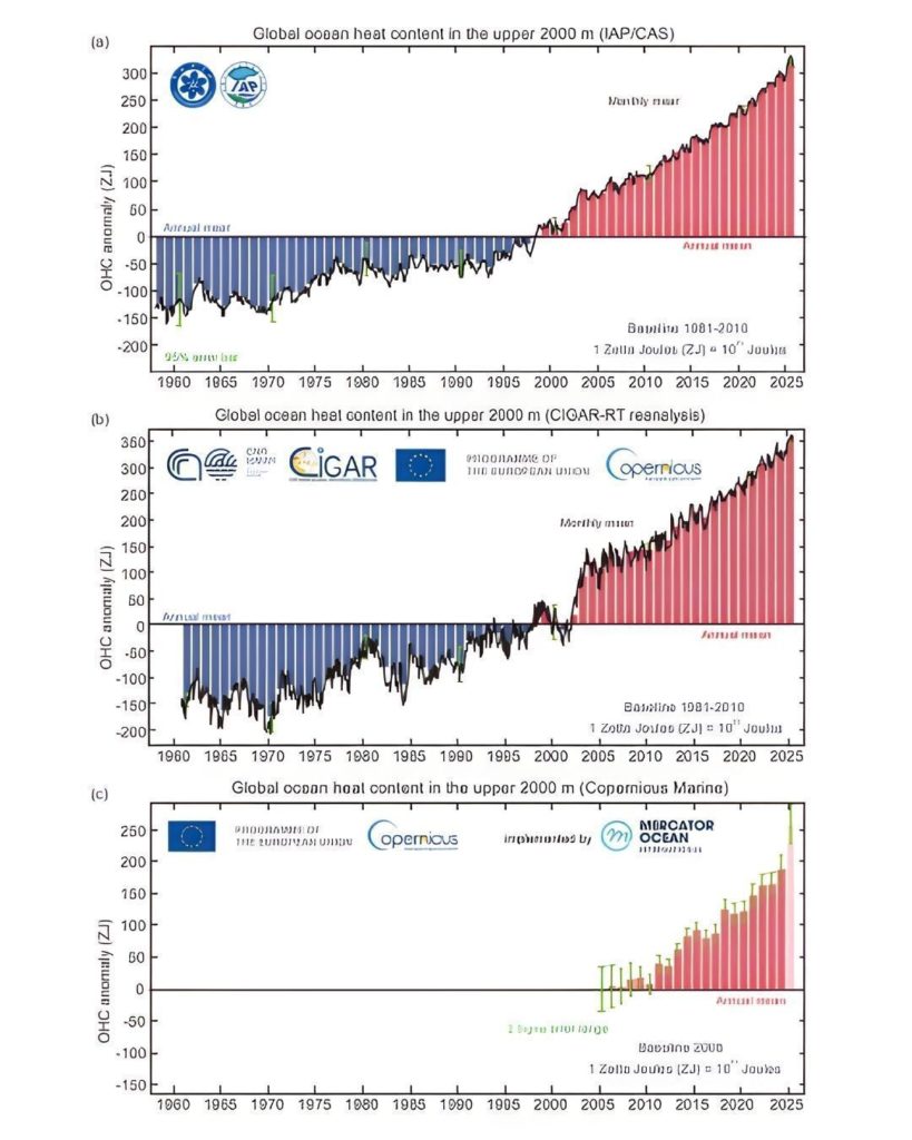 Le masse d’acqua intermedie, che si formano nel Mediterraneo orientale e si propagano verso ovest, stanno trasportando l’aumento di temperatura all’interno del bacino, contribuendo a una redistribuzione del calore anche negli strati più profondi. In un mare semi-chiuso come il Mediterraneo, questo processo rende il sistema particolarmente reattivo ai cambiamenti climatici: il surplus di calore modifica la stratificazione delle acque, influenza l’ossigenazione e la circolazione marina, e si somma ad altri fenomeni già in atto, come salinizzazione e acidificazione. Anche se nel 2025 la temperatura superficiale globale è risultata leggermente inferiore rispetto al 2024 per effetto di La Niña, il calore totale immagazzinato nell’oceano ha continuato a crescere. Ed è proprio questo accumulo di energia negli strati profondi che rappresenta l’indicatore più solido del disequilibrio energetico del sistema climatico. La figura, tratta dall’articolo, mostra l’andamento del contenuto di calore globale nei primi 2000 metri dal 1958 al 2025 secondo tre dataset indipendenti:(a) IAP/CAS: ricostruzione basata su osservazioni in situ (profili Argo e database oceanografici).(b) CIGAR-RT: reanalisi oceanica che integra osservazioni e modello numerico (con contributo CNR-ISMAR).(c) Copernicus Marine: prodotto operativo basato principalmente su dati Argo.Tutti mostrano la stessa tendenza e confermano il record del 2025.
