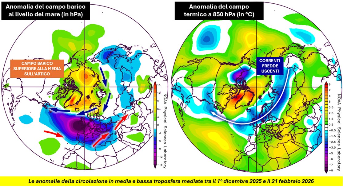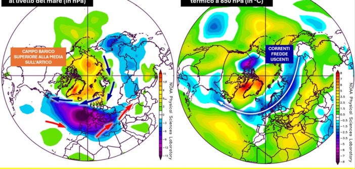 Da una prima analisi sulla collocazione delle anomalie del campo di pressione al livello del mare emerge infatti un segnale positivo proprio in area polare, contrapposto a un segnale marcatamente negativo che ha invece dominato l’area atlantica e che è stato proprio il motore responsabile dell’incessante flusso perturbato che si è susseguito tra la fine di dicembre e una decina di giorni fa (figura a sinistra).