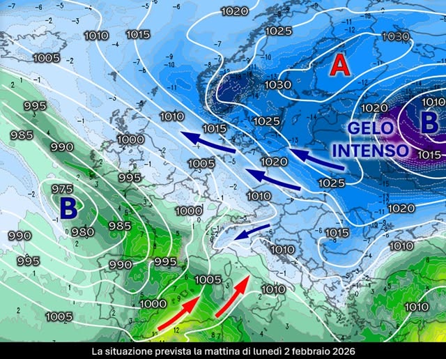 Mentre le regioni meridionali e le due Isole Maggiori sono interessate dall’ennesima perturbazione in movimento da ovest verso est sotto la guida di una depressione giunta sull’area ionica, continua il braccio di ferro tra la vasta circolazione ciclonica più temperata presente sul vicino Oceano e quella gelida che rimane ben ancorata sull’Europa orientale e che, a fasi alterne, riesce a estendere la propria influenza verso i paesi d’oltralpe e la penisola balcanica. In questo modo, il passaggio delle figure di bassa pressione alle nostre latitudini riesce a richiamare parte di questa aria fredda, facendola sia sconfinare sul versante adriatico e sia accumulare sul Nord Italia, specie sul settore occidentale tra il Piemonte e il versante padano del Ponente Ligure dove la morfologia del territorio dà luogo a una sorta di «effetto imbuto» e il baluardo alpino funziona come se fosse la parete di un contenitore che si riempie di questa massa d’aria fredda. La dinamica si completerà entro le prossime 24-36 ore e precederà un nuovo cambiamento del tempo che si farà strada da lunedì 2 febbraio con il passaggio di un’altra perturbazione.