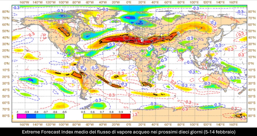 Pioggia, pioggia e ancora pioggia. Non ci saranno sostanziali novità nello stato del tempo di casa nostra fino alla metà di febbraio perché almeno fino a quella data le nostre latitudini continueranno molto probabilmente a essere una strada molto trafficata di sistemi perturbati atlantici che seguiteranno a raggiungere l’Italia passando dalla penisola iberica. È davvero significativo, a tal proposito, far notare come nei prossimi dieci giorni la distribuzione dei flussi di vapore acqueo a scala globale sia particolarmente concentrata proprio alle nostre latitudini, tanto da essere attraversate da un vero e proprio fiume in piena di aria estremamente umida proveniente dall’Oceano Atlantico subtropicale: un carico di materia prima per la formazione di nubi e di precipitazioni che, secondo gli ultimi aggiornamenti dei modelli numerici, risulterà ben superiore a quello che dovremmo avere in questo periodo dell’anno, tanto da risultare davvero insolito come ci viene suggerito dai valori massimi assunti dall’Extreme Forecast Index.