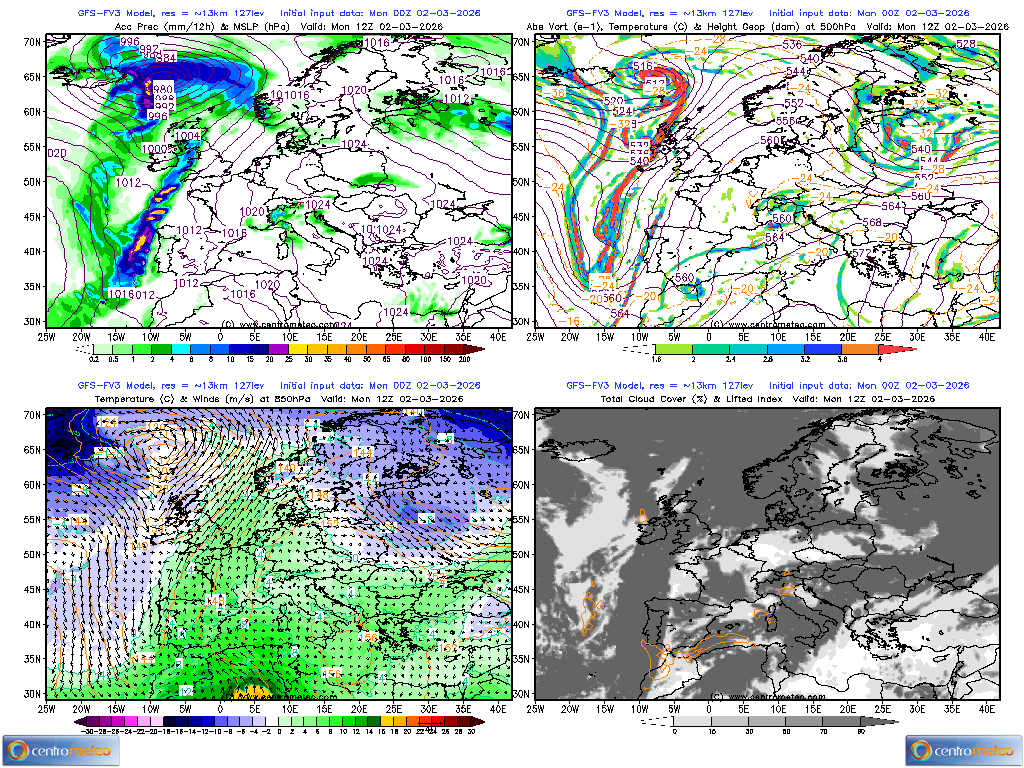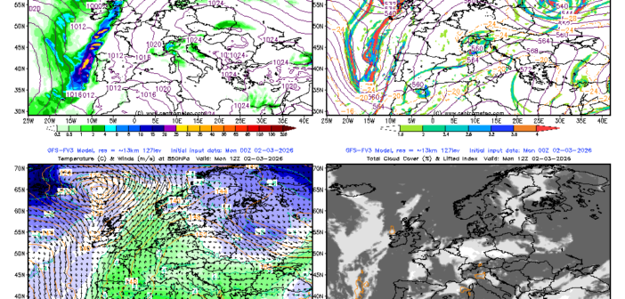 Alcune sacche di aria fredda sono presenti dalla Romania verso la Penisola Scandinava, finendo in Russia. Da alcuni giorni i modelli propongono un Vortice Polare molto disturbato: per i primi di Marzo nella stratosfera i venti zonali che ruotano attorno al Polo Nord potrebbero invertire la direzione ed assistere alla divisione in due lobi del Vortice Polare.