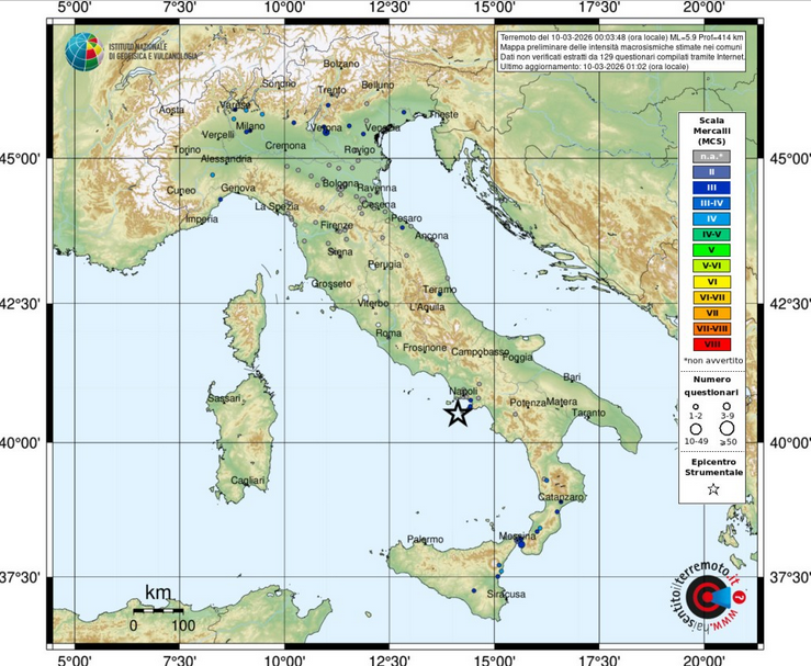 Il 10 marzo 2026 alle ore 00:03 italiane è avvenuto un terremoto di magnitudo ML 5.9 al largo della costa campana. L’evento sismico è stato localizzato a una profondità estremamente elevata, circa 414 km, ben al di sotto delle comuni profondità sismogenetiche dei terremoti italiani, che avvengono prevalentemente nella crosta superiore.